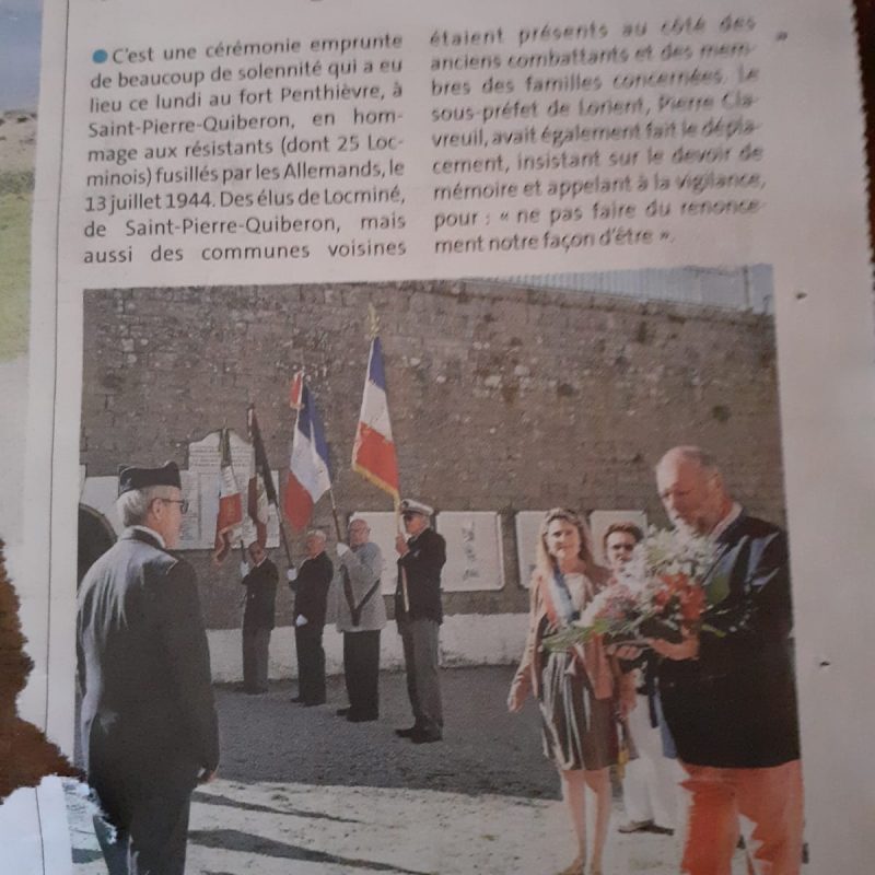 Comme tous les ans, une cérémonie s’est déroulée au monument aux morts du fort de Penthièvre en mémoire des 59 résistants fusillés lors de la seconde guerre mondiale. Les allocutions ont été prononcées par la nouvelle maire de Saint Pierre Quiberon, Mme Stéphanie Doyen, le maire de Locminé, M. Grégoire Super, le président de l’ANACR 56 (association nationale des anciens combattants et résistants), M. Jean Pierre Fouille et le sous-préfet de Lorient, avant un dépôt de gerbes collectif à la mémoire des 59 fusillés les 13 juillet 1944 au Fort de Penthièvre.
