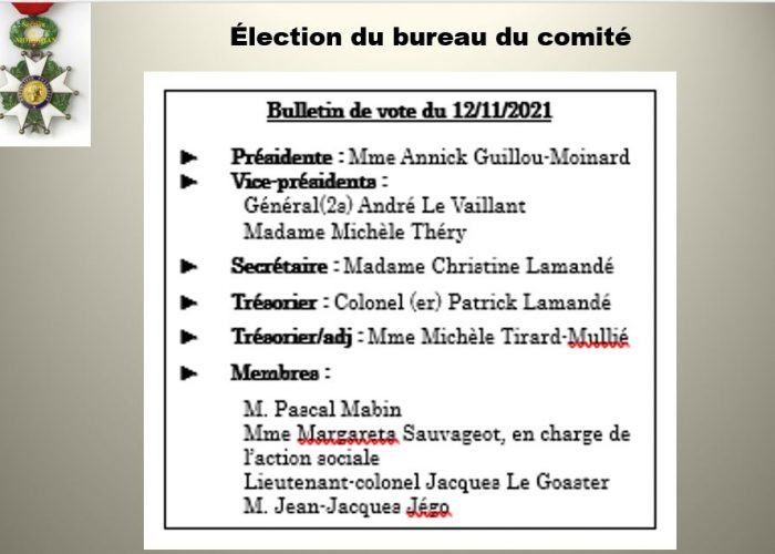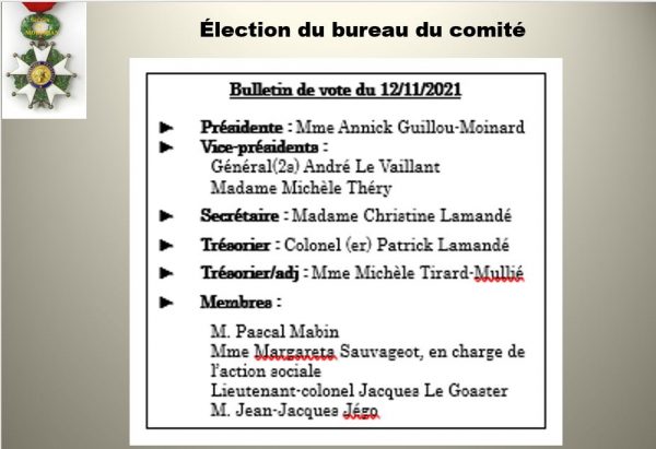 Tous les sortants ont été réélus ; à noter la présence d’un nouveau membre qui vient d’arriver dans le comité, Mme MIchèle Tirard-Mullié qui prend la fonction de trésorier/adjoint.