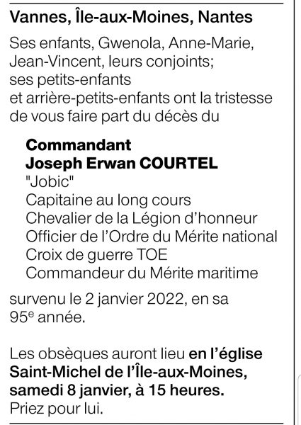 Les obsèques de notre ami Jobic,membre du bureau de la Section ont eu lieu ce samedi 8 janvier 2022 en l’église de l’île aux Moines devant une très nombreuse assistance,autour de ses enfants et petits enfants. La Section était représentée par dix de ses membres dont notre porte-drapeau, jean-pierre TEISSIER, insi que Bruno BODARD nouveau président du Comité du Pays de Vannes, notre Président, le Général PRÉVOST, et notre président d’honneur, le Général DECOURTIS.