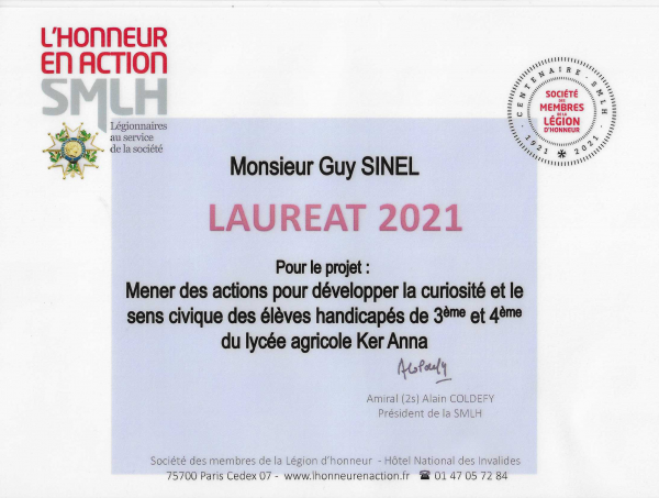 •  Le 13 Avril, le président du comité du Pays de Lorient a participé à la cérémonie de remise   des Prix de l’Honneur en action 2021,  aux Invalides à Paris, siège de la SMLH et a reçu le diplôme de Lauréat