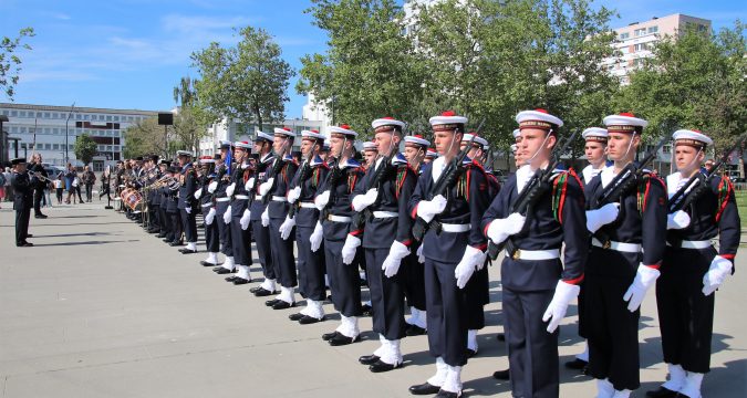 Puis, place Louis-Glotin, devant une foule importante composée de jeunes, de familles, des représentants des associations patriotiques, d’ élus, le contre-amiral Pierre de Briançon, commandant la Marine à Lorient a passé les troupes en revue et a décoré plusieurs officiers et officiers mariniers .