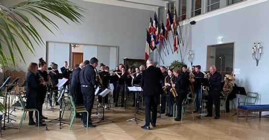Enfin, après un court diaporama réalisé par les archives municipales de Lorient reprenant l’exposition de 2010-2011 « 23 avril 1950, une visite particulière hommage d’un président de la République à une ville qui se relève », l’harmonie municipale a débuté son concert par la Marseillaise suivie de l’hymne national ukrainien.