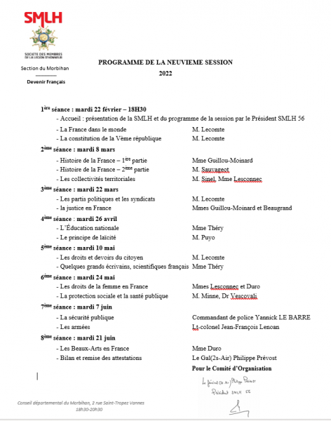 - La troisième séance de la session 2022 de « Devenir Français » s’est tenue le mardi 22 mars dans la salle plénière du conseil départemental en présence de notre président, le général(2s) Philippe Prévost, de Roland Mergel, secrétaire de la section, de Chantal Lesconnec, d’Anne-Marie Duro et de jacques Joly, membres du bureau et de Guy de Kersabiec, président du comité de Ploermel-Coëtquidan.