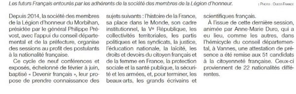 - La première séance de la neuvième session de « Devenir Français » , organisée au profit des futurs naturalisés français résidant dans le Morbihan, s’est déroulée le 22 Février dernier de 18h30 à 20h au sein de l’hémicycle du Conseil Départemental , en présence de 33 auditeurs et d’une dizaine de membres de notre section, organisateurs et intervenants dans la session.Madame Christine Penhouët, vice-présidente du Conseil Départemental, accompagné de Mr François Fontaine, directeur général adjoint du département, a souhaité la bienvenue aux participants en rappelant le soutien du Conseil à cette action de notre section, puis notre Président, le Général Philippe Prévost a donné des informations pratiques et présenté les caractéristiques essentielles de la société des membres de la Légion d’Honneur.Enfin, Pascal Lecomte, 1er vice-président de la section, a présenté les deux premiers modules consacrés à « la France dans le Monde » et « la Constitution de la Vème République », assisté par notre Webmaster-trésorier Patrick Lamandé pour la projection des diapositives.