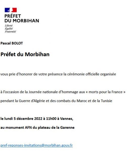 la cérémonie commémorative du 5 décembre 2022 s’est tenue sur le plateau de la Garenne devant les monuments dédiés aux soldats morts en Afrique du Nord. Elle a été présidée par le Préfet du Morbihan, M. Pascal Bolot, et la Section était représentée par le 1er Vice-président et plusieurs autres membres du bureau et notre porte-drapeau, Jean-Pierre Tessier était entouré de 23 autres porte-drapeaux.