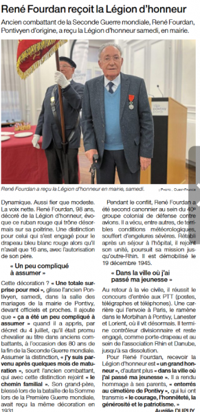 Le 22 novembre 2025, dans le salon d’honneur de la mairie de Pontivy, M René Fourdan enfant du Pays fait chevalier de la légion d’honneur par M Jean-Pierre Le Roch ancien député maire de Pontivy.