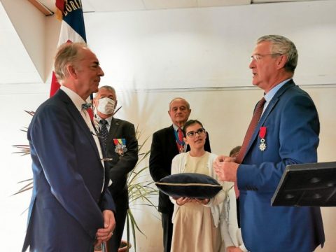 Patrick Loriquet, à gauche, a reçu l’insigne de Chevalier de la Légion d’honneur des mains de Patrick Strzoda, directeur de cabinet du président de…